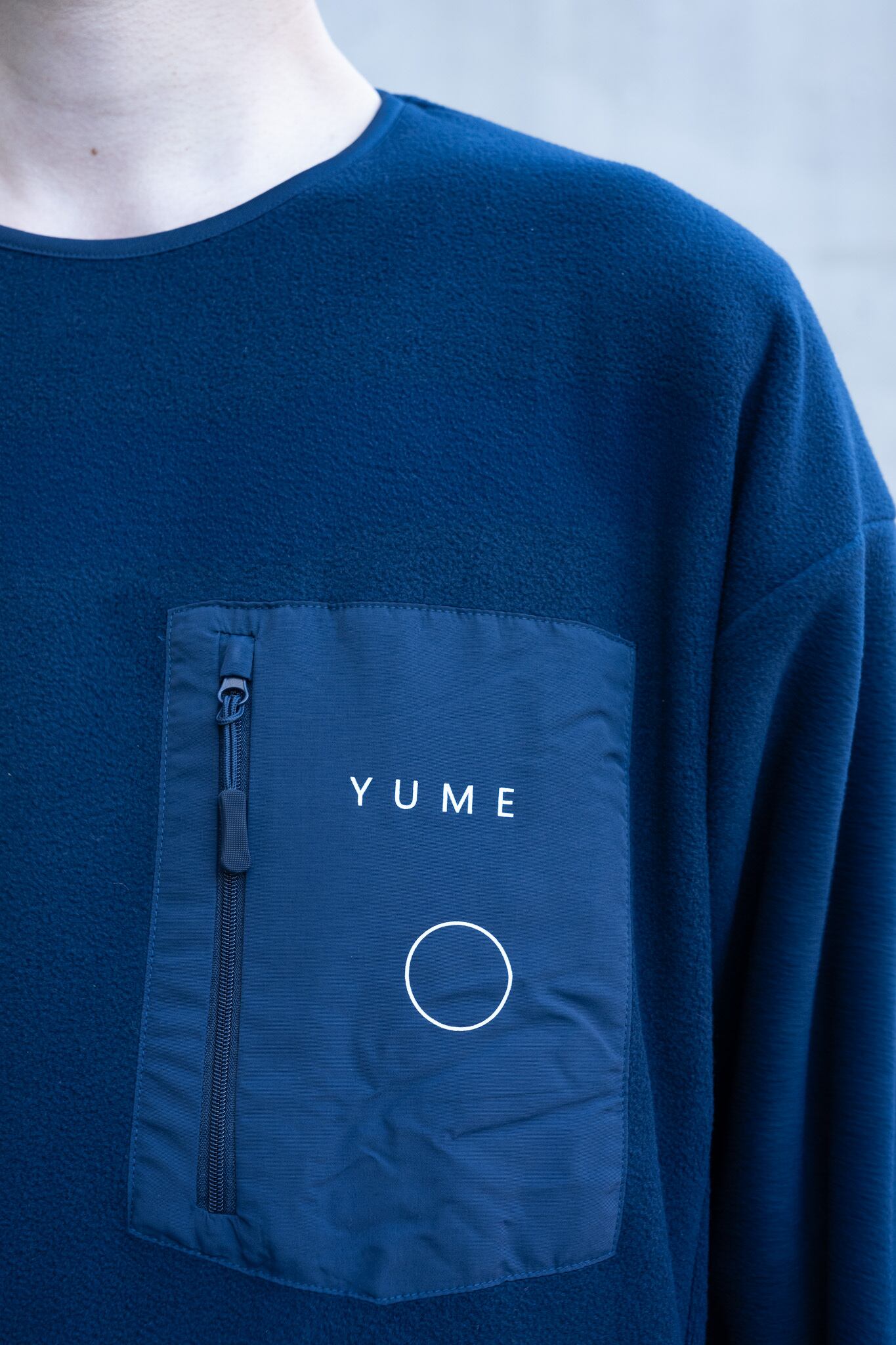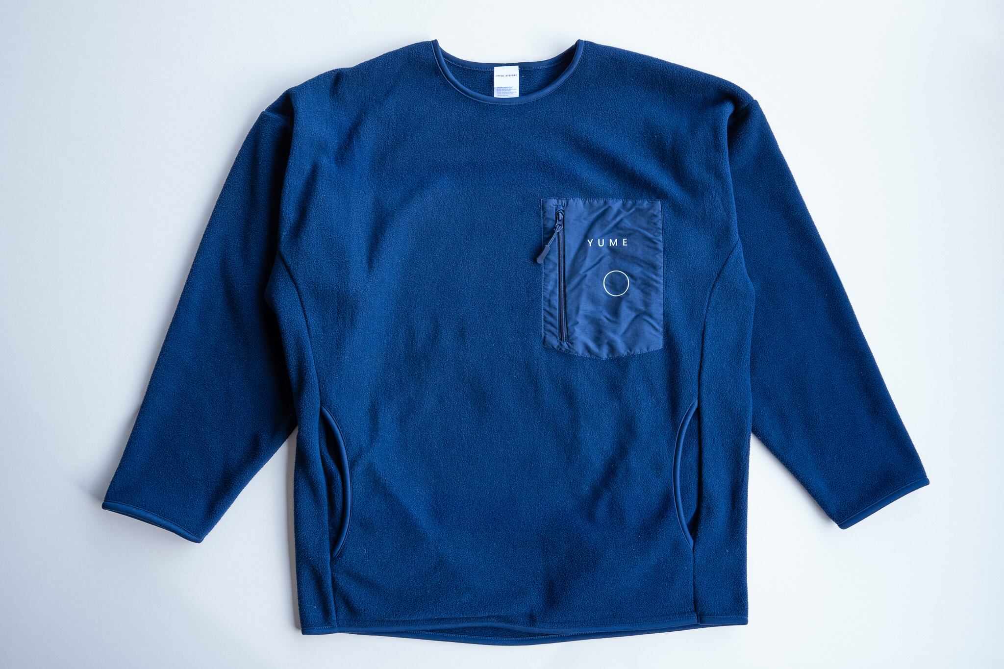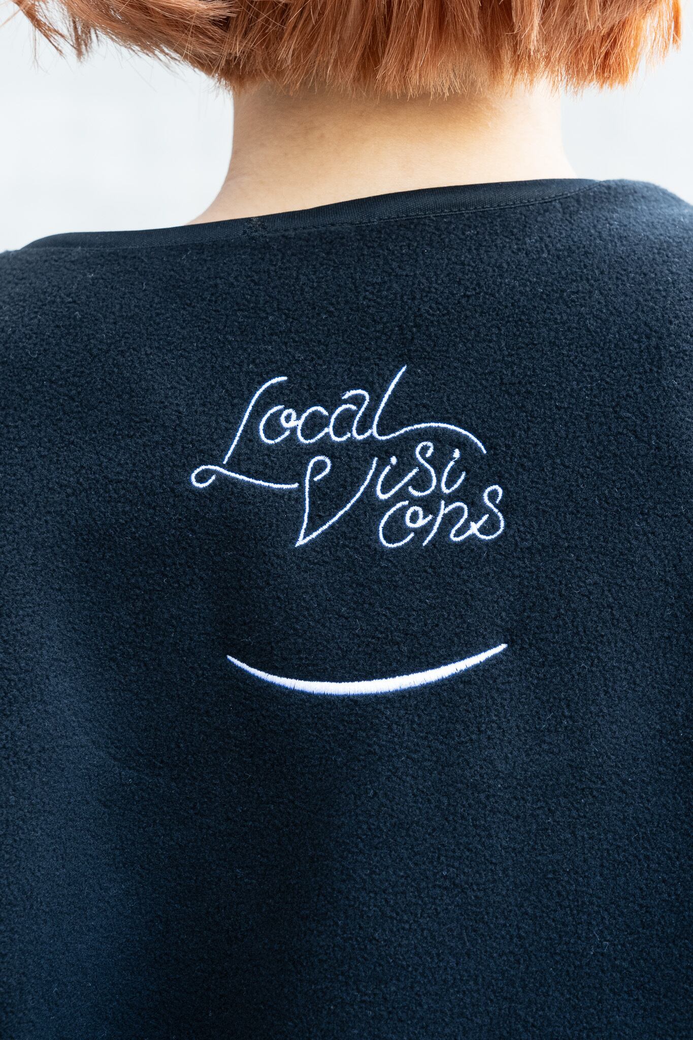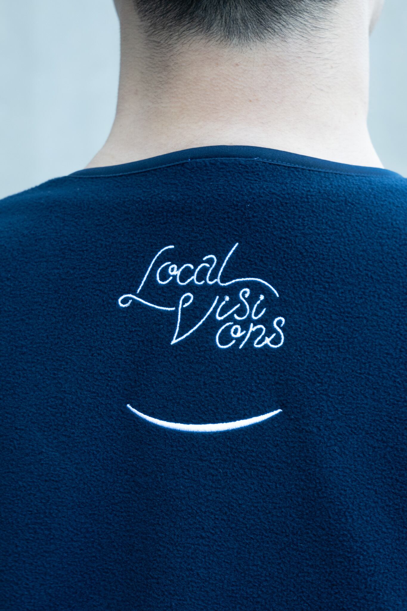 肌触りと保温性能が抜群のフリースに、前面にはミヤオウの展覧会にちなんだ「YUME」の文字と展覧会の象徴的な造形であるサークルをプリント、背面にはLocal Visionsとミヤオウのロゴが刺繍されています。