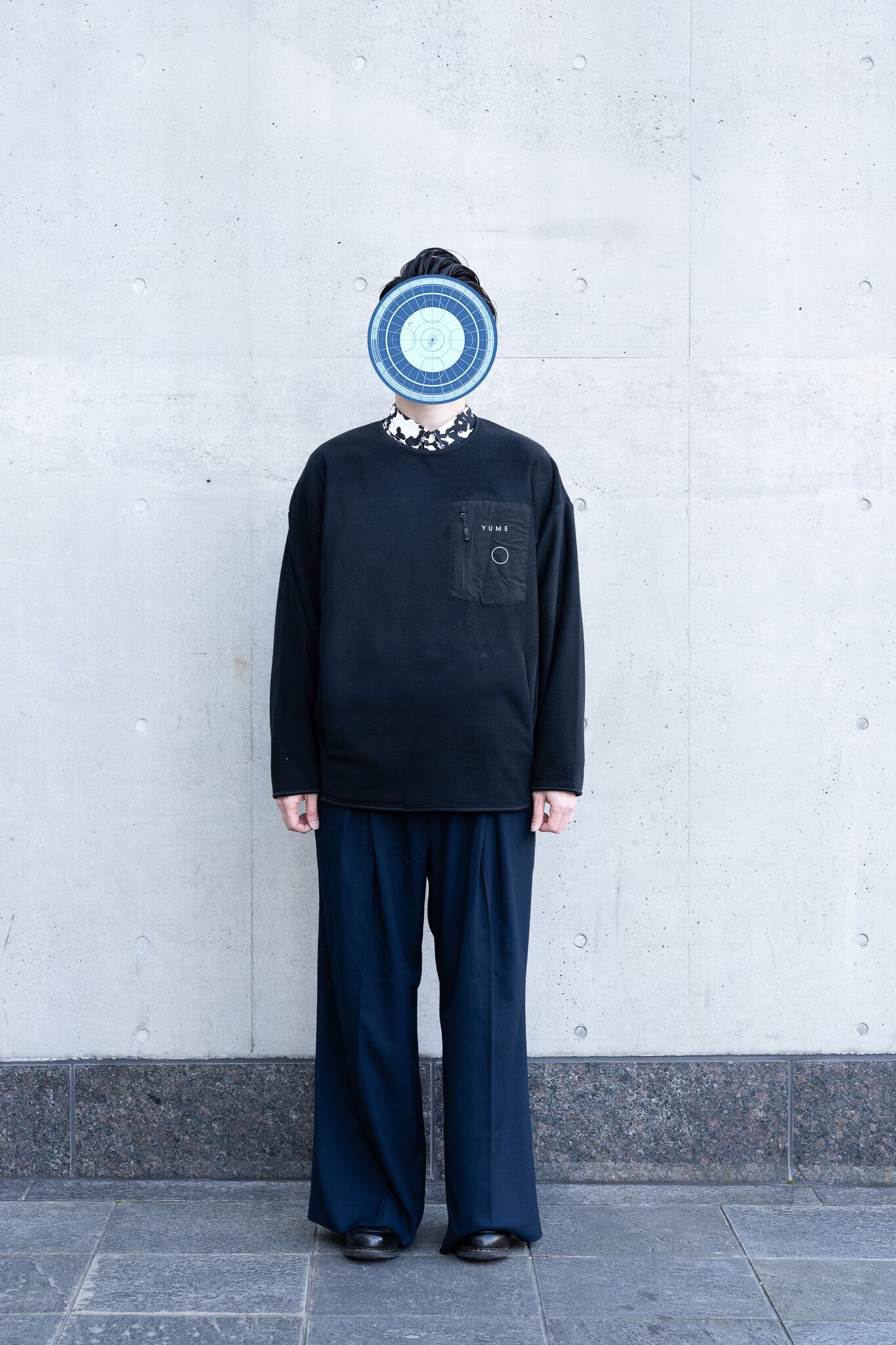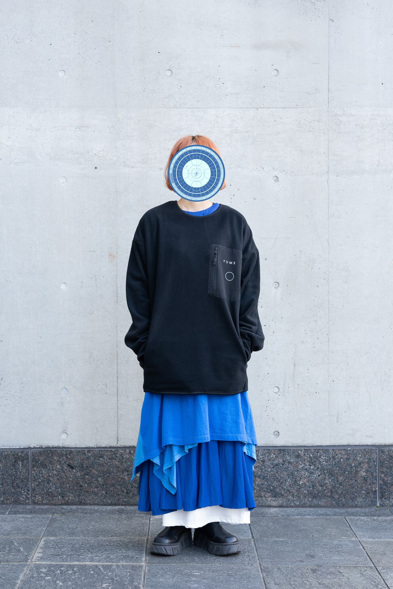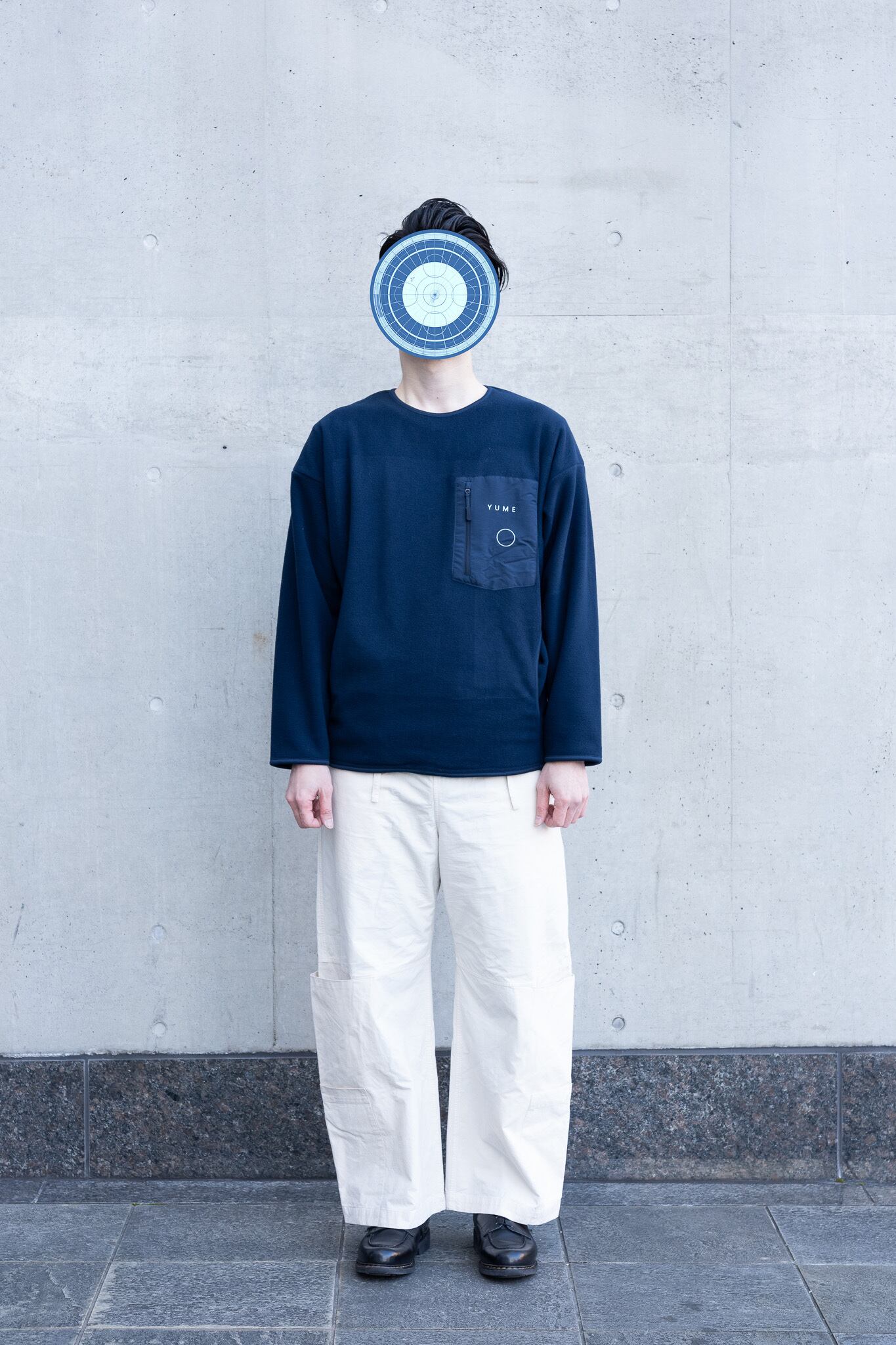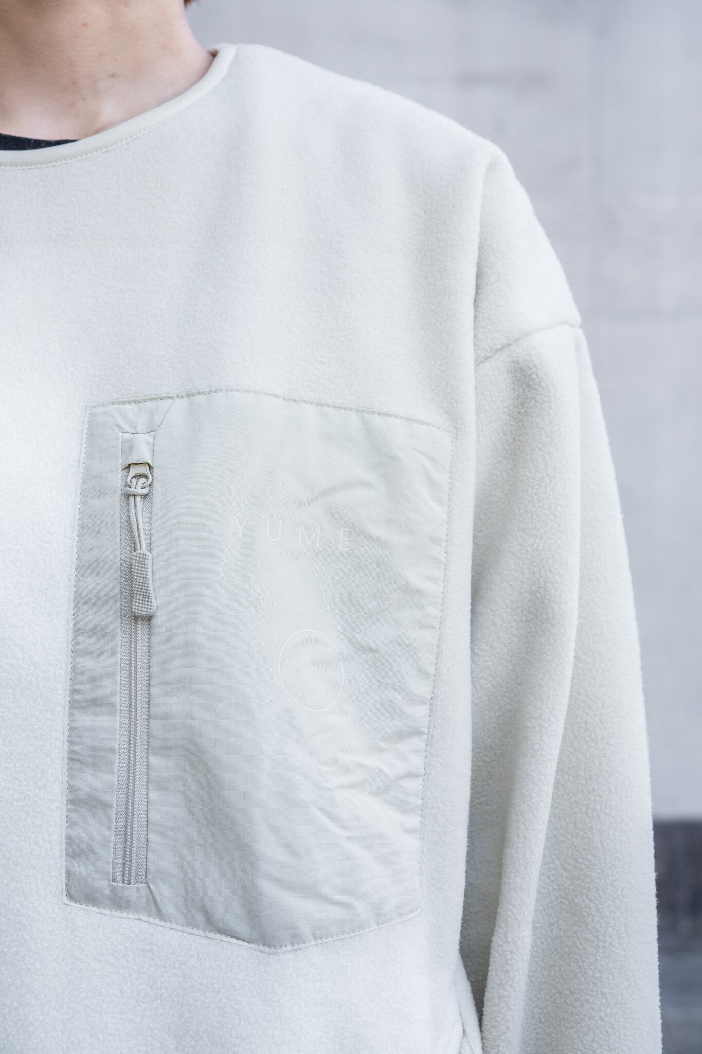 肌触りと保温性能が抜群のフリースに、前面にはミヤオウの展覧会にちなんだ「YUME」の文字と展覧会の象徴的な造形であるサークルをプリント、背面にはLocal Visionsとミヤオウのロゴが刺繍されています。